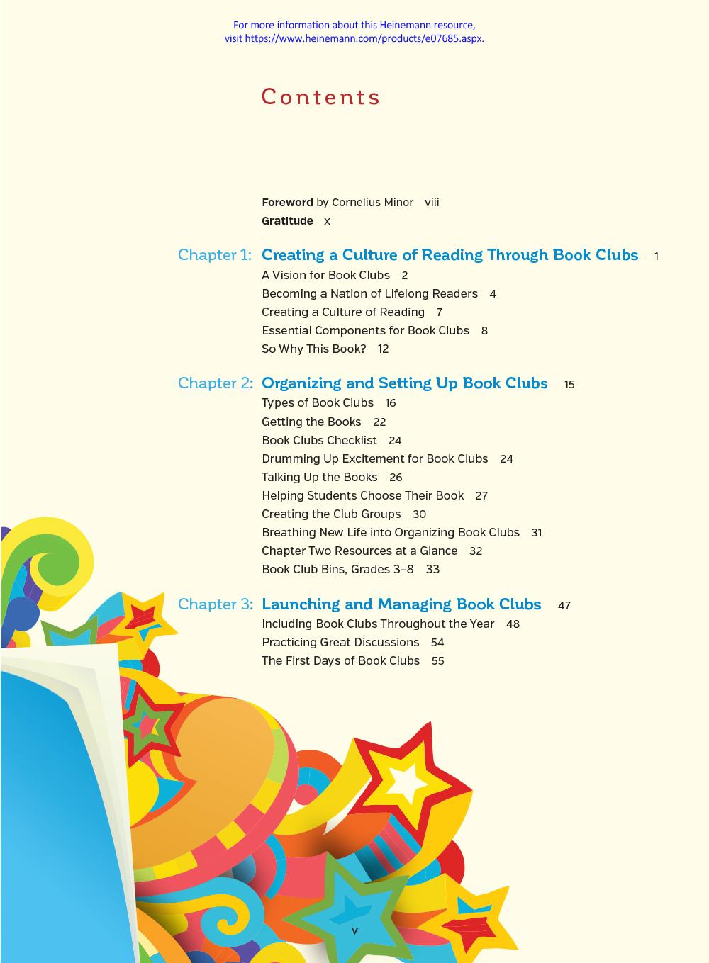 • Suggested “book bins” for book club work, organized by grade level and genre.
