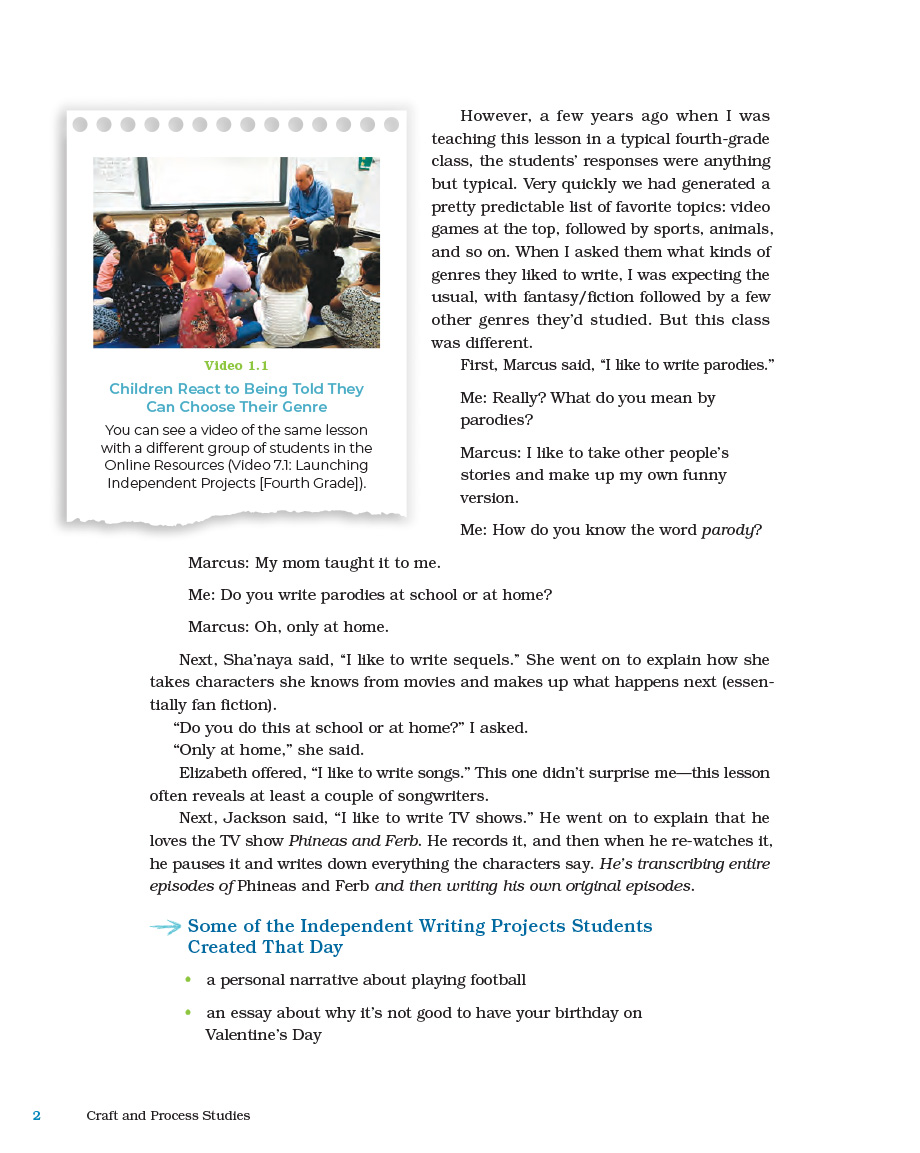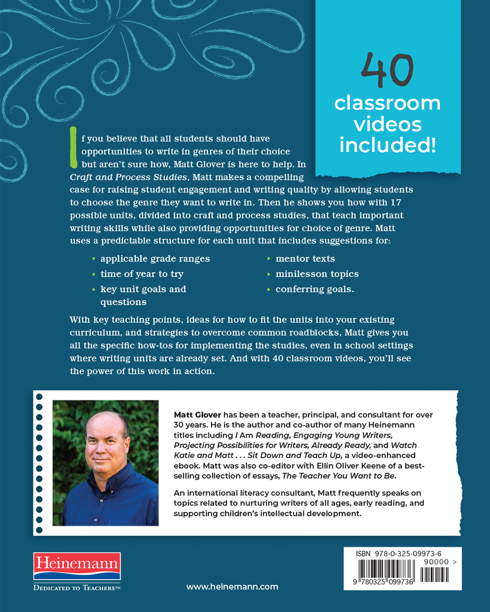 “In Craft and Process Studies, master teacher Matt Glover recovers a key, maybe the key, principle of writing instruction—choice. Too often, students are marched through genre units, often presented as distinct types, with little opportunity to write about what matters most to them. Genre becomes not a resource, but a constraint. A means becomes an end. Matt retains the idea of a units of study, focusing on processes and issues of craft that can apply to whatever genre the student might choose. In the best tradition of mentor texts, these units build insights inductively, by a careful study of what authors actually do. What’s more—we get to see Matt in action, conducting conferences and mini lessons in over forty video clips.”—Thomas Newkirk