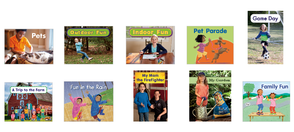• 10 original titles (6 copies of each title) at text level A on the F&P Text Level Gradient™: Pets; Outdoor Fun; Indoor Fun; Pet Parade; Game Day; A Trip to the Farm; Fun in the Rain; My Mom the Firefighter; My Garden; Family Fun