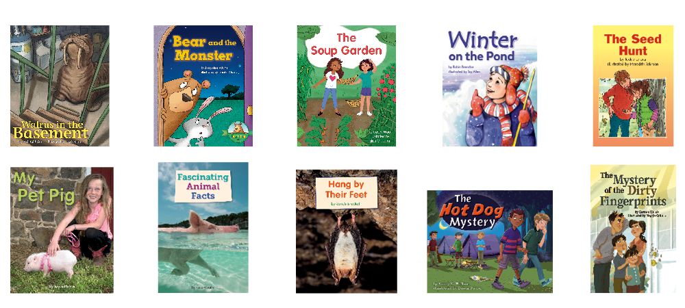 • 10 original titles (6 copies of each title) at text level H on the F&P Text Level Gradient™: Walrus in the Basement; Bear and the Monster; The Soup Garden; Winter on the Pond; The Seed Hunt; My Pet Pig; Fascinating Animal Facts; Hang by Their Feet; The Hot Dog Mystery; The Mystery of the Dirty Fingerprints
