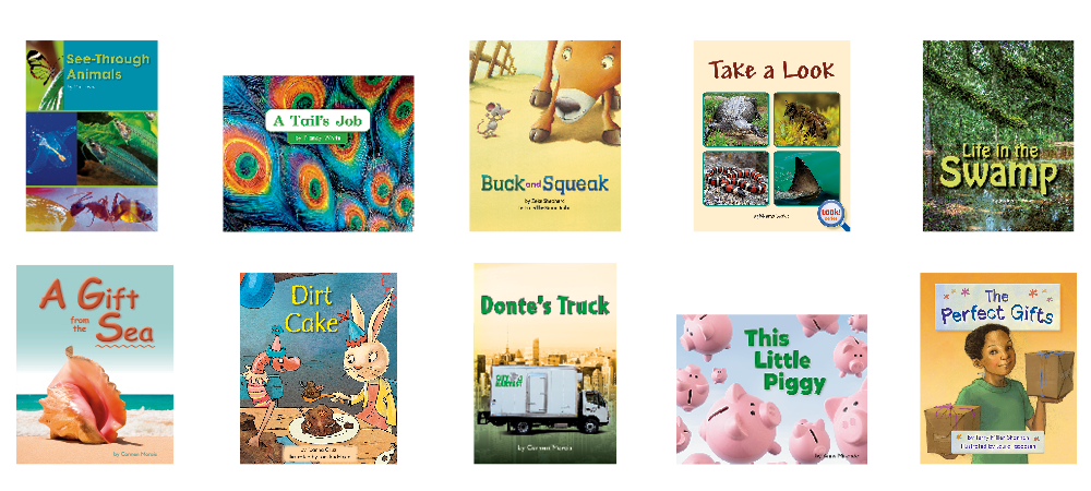 • 10 original titles (6 copies of each title) at text level I on the F&P Text Level Gradient™: See-Through Animals; A Tail's Job; Buck and Squeak; Take a Look; Life in the Swamp; A Gift from the Sea; Dirt Cake; Donte's Truck; This Little Piggy; The Perfect Gifts