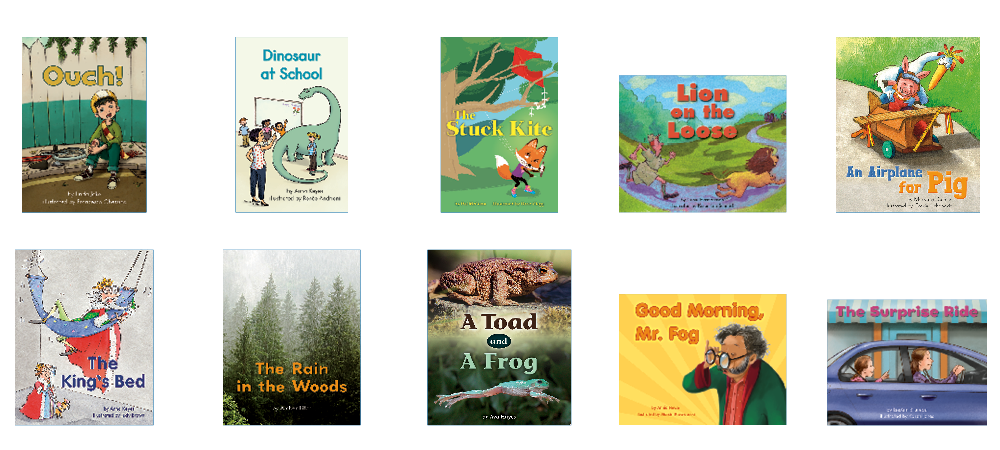 • 10 original titles (6 copies of each title) at text level E on the F&P Text Level Gradient™: Ouch!; Dinosaur at School; The Stuck Kite; Lion on the Loose; An Airplane for Pig; The King's Bed; The Rain in the Woods; A Toad and a Frog; Good Morning, Mr. Fog; The Surprise Ride