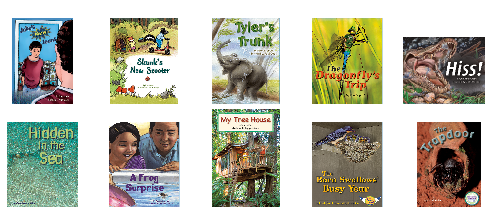 • 10 original titles (6 copies of each title) at text level I on the F&P Text Level Gradient™: Jake's New Jeans; Skunk's New Scooter; Tyler's Trunk; The Dragonfly's Trip; Hiss!; Hidden in the Sea: Based on a True Story; The Frog Surprise; My Tree House; The Barn Swallows' Busy Year; The Trapdoor