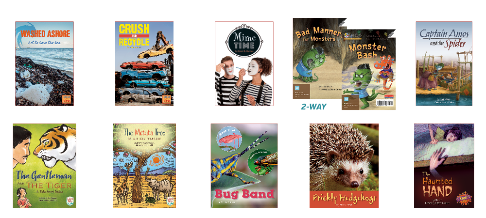 • 10 original titles (6 copies of each title) at text level M on the F&P Text Level Gradient™: Washed Ashore: Art to Save the Sea; Crush and Recycle; Mime Time; Bad Manners for Monsters / Monster Bash (two-way book); Captain Amos and the Spider; The Gentleman and the Tiger; The Motata Tree: An African Folktale; Bug Band; Prickly Hedgehog; The Haunted Hand