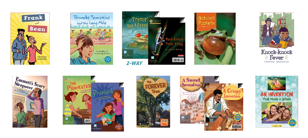 • 10 original titles (6 copies of each title) at text level M on the F&P Text Level Gradient™: Frank and Bean; Thumbs Tompkins and the Long Mile; Trevor's Big Adventure / Red-Eyed Tree Frog (two-way book); Nature's Pockets; Knock-knock Fever; Emmett's Scary Sleepover; Pranked / The Prankster (two-way book); The Forever Tree; A Sweet Invention / A Crispy Invention (two-way book); An Invention that Made a Splash