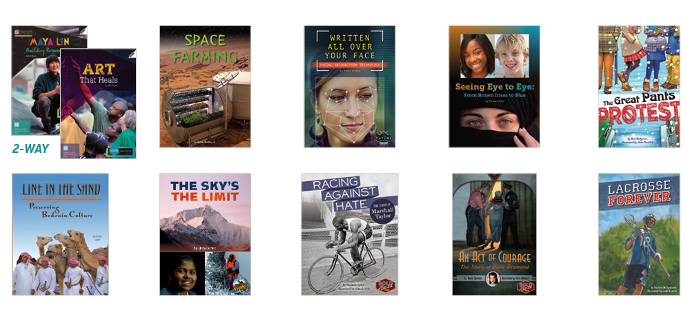• 10 original titles (6 copies of each title) at text level X on the F&P Text Level Gradient™: Art that Heals; Maya Lin: Building Remembrance (two-way book); Space Farming; Written All Over Your Face: Facial Recognition Technology; Seeing Eye to Eye: From Brown Irises to Blue; The Great Pants Protest; Line in the Sand: Preserving Bedouin Culture; The Sky's the Limit; Racing Against Hate: The Story of Marshall Taylor; An Act of Courage: The Story of Viola Desmond; Lacrosse Forever