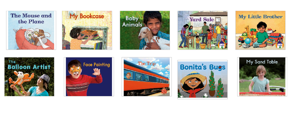 • 10 original titles (6 copies of each title) at text level A on the F&P Text Level Gradient™: The Mouse and the Plane; My Bookcase; Baby Animals; Yard Sale; My Little Brother; The Balloon Artist; Face Painting; The Trip; Bonita's Bugs; My Sand Table