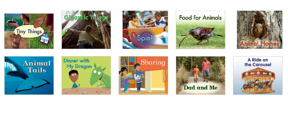 • 10 original titles (6 copies of each title) at text level B on the F&P Text Level Gradient™: Tiny Things; Gigantic Things; Spin!; Food for Animals; Animal Homes; Animal Tails; Dinner with My Dragon; Sharing; Dad and Me; A Ride on the Carousel