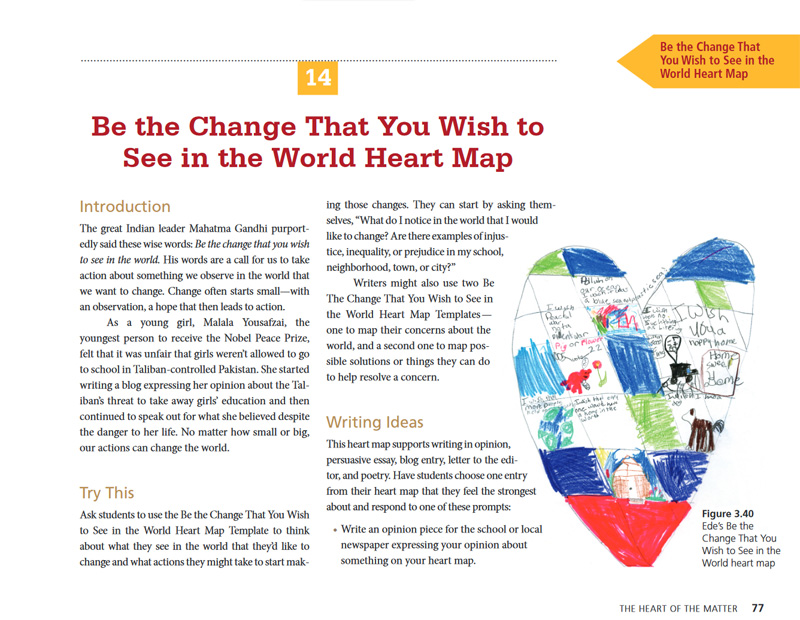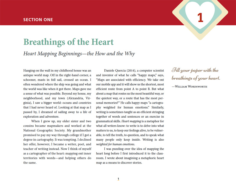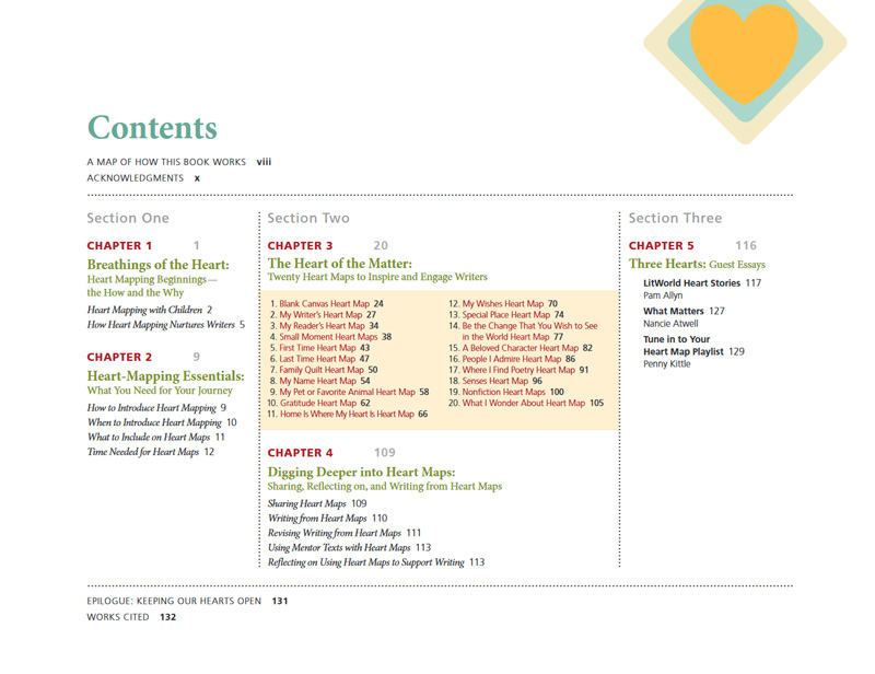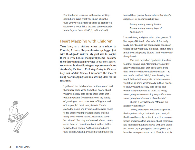 “We understand that children read and write more earnestly and truthfully when engaged by emotion. We have, in Heart Maps, a stunning array of potential discoveries for young readers and writers: discoveries about what really lies within our complex emotional lives; about the budding passion they find in the social or natural world; and about the hearts of those around them. The discoveries and insights children will make as they craft heart maps will be lasting and profound.”