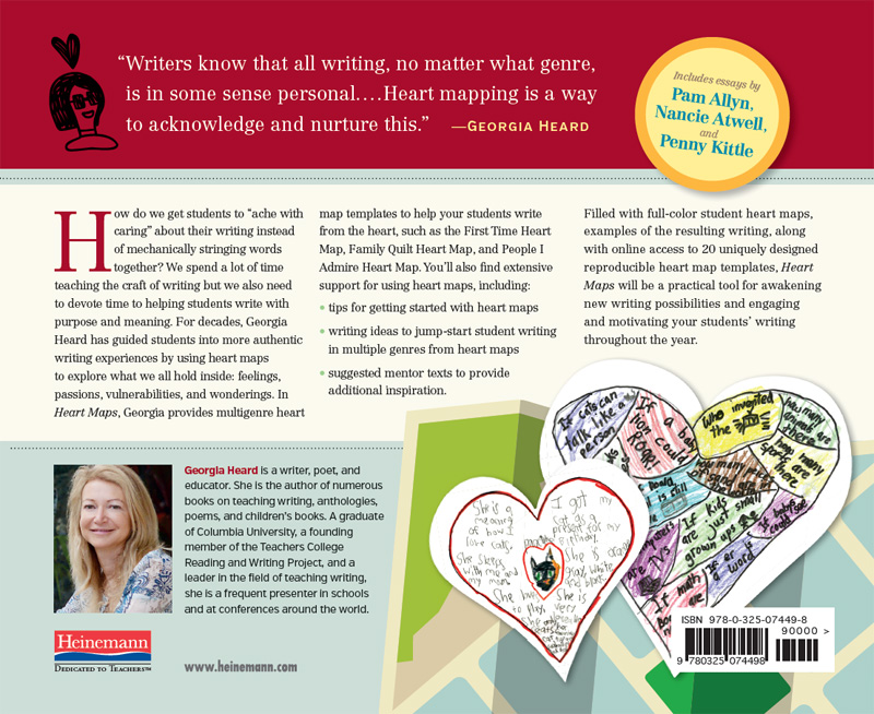 “Passion drives effort. If we want students to invest effort in learning to write well, we must provide opportunities to explore their passions and find relevance in their writing. Georgia Heard shows us how to open students’ hearts, discover their stories, and bring their passions to the page. Rich with practical strategies, student examples, and lists of mentor texts, Heart Maps is a book that I will use and recommend to teachers for years to come.”
