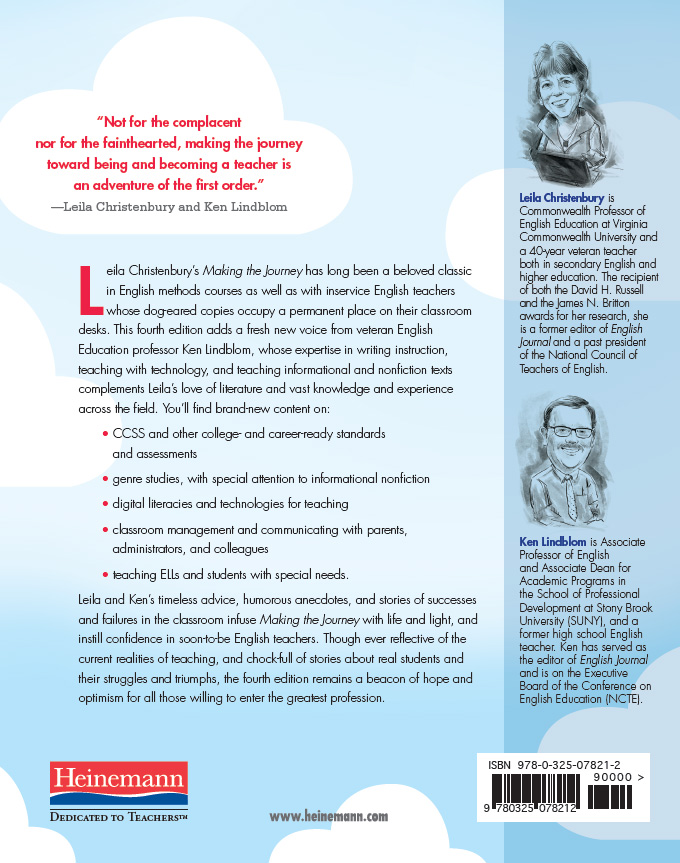 Leila and Ken’s timeless advice, humorous anecdotes, and stories of successes and failures in the classroom infuse Making the Journey with life and light, and instill confidence in soon-to-be English teachers. Though ever reflective of the current realities of teaching, and chock full of stories about real students and their struggles and triumphs, the Fourth Edition remains a beacon of hope and optimism for all those willing to enter the greatest profession.