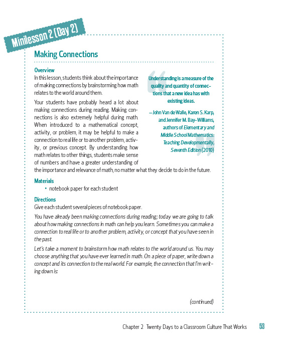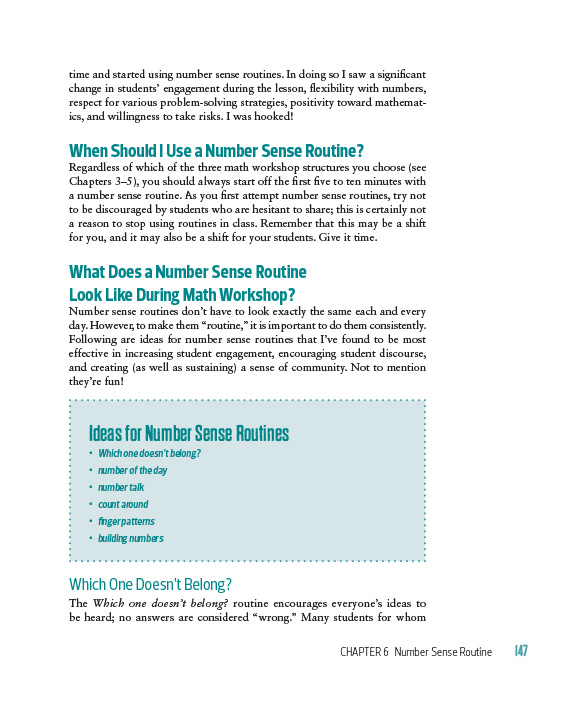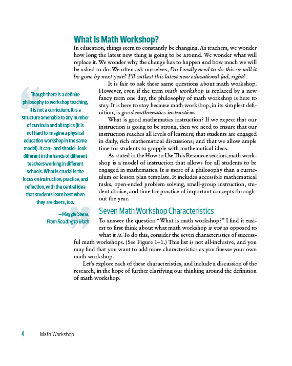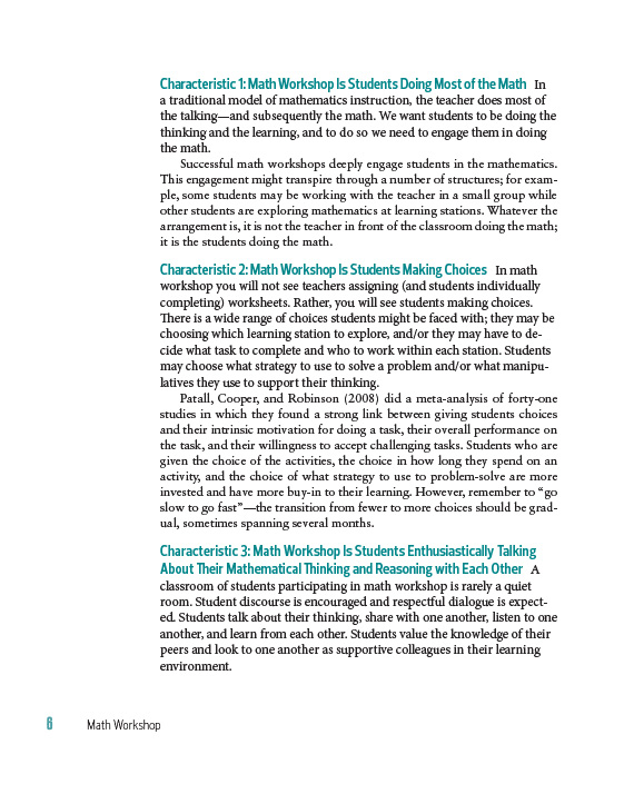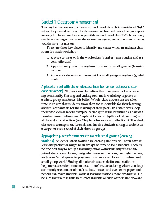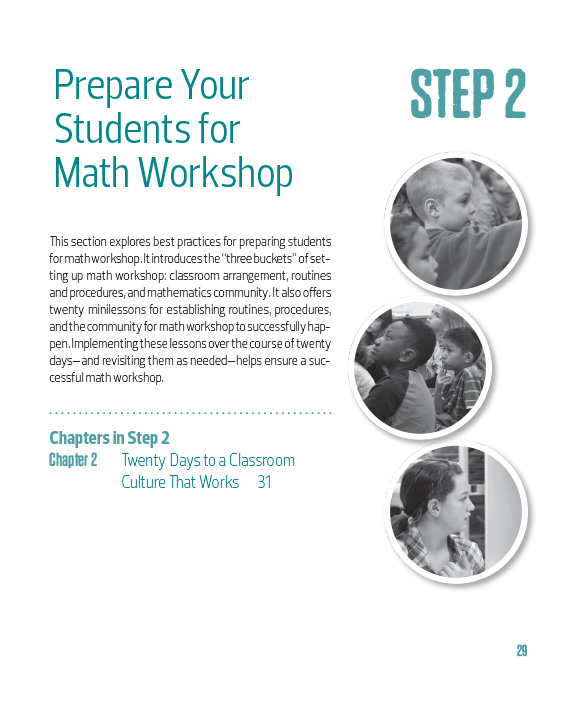 The resource then offers “Twenty Days to a Classroom Culture That Works,” which includes 20 minilessons that support the communication and practice of expectations surrounding the workshop model. From there, it explores three classroom-tested math workshop structures, providing practical ideas for routines, focus lessons, guided math groups, learning stations, and reflections so you can get started with math workshop in your classroom today.