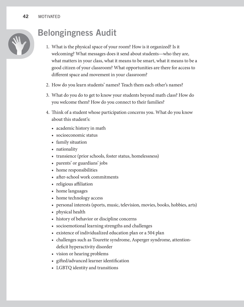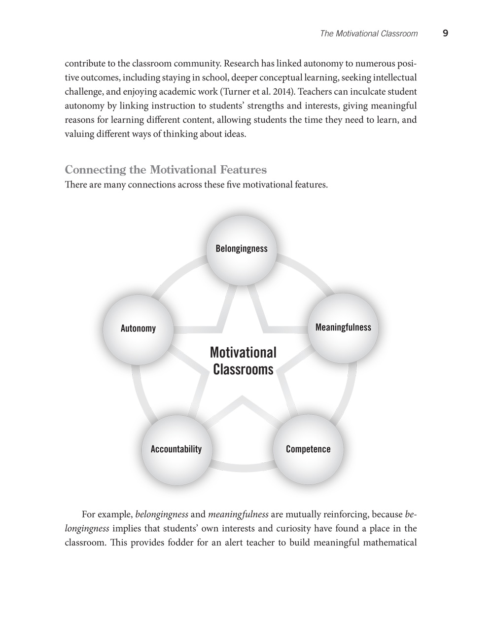 These features of motivational math classrooms are explored in-depth. You’ll find suggestions for identifying what impedes each factor, along with strategies for weaving them into your instruction. You’ll also be introduced to an online community who support each other’s efforts to teach this way.