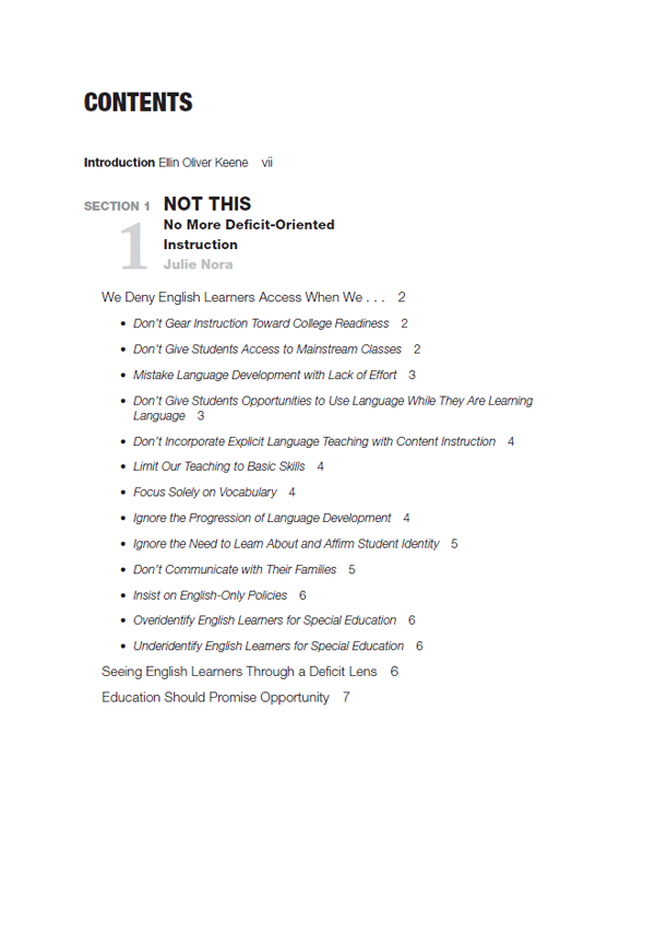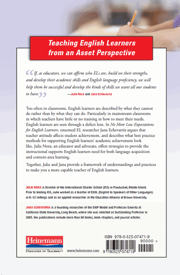Too often in classrooms, English Learners are described by what they cannot do, rather than by what they can do. Particularly in mainstream classrooms in which teachers have little or no training in how to meet their needs, ELs are seen through a deficit lens. In No More Low Expectations for English Learners, esteemed EL researcher Jana Echevarría argues that teacher attitude affects student achievement, and describes what best practice methods for supporting ELs academic achievement look like. Julie Nora, an educator and advocate, offers strategies to provide the instructional supports ELs need for both language acquisition and content-area learning.