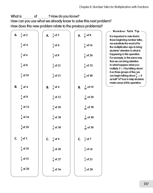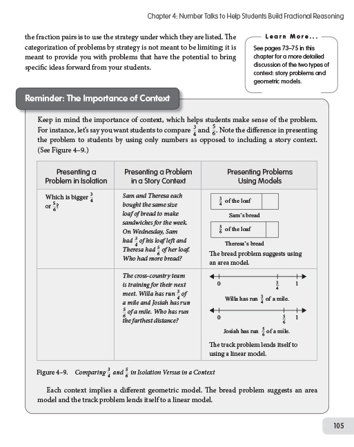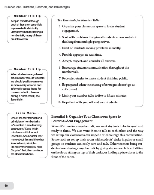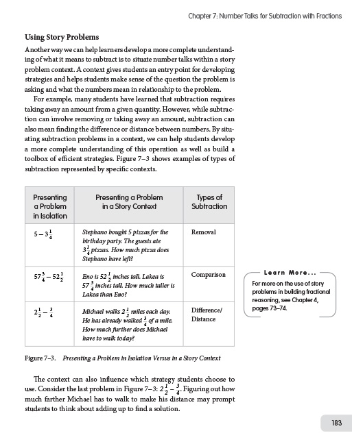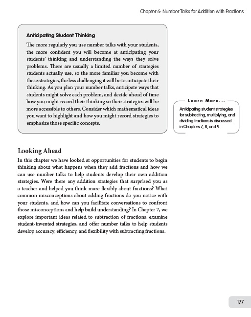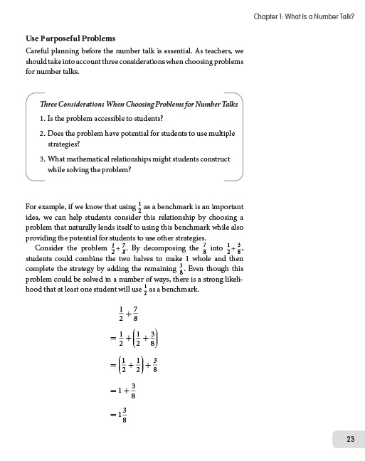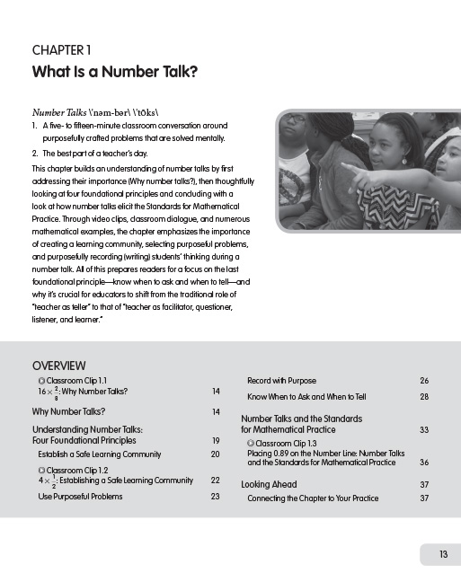 While Number Talks: Whole Number Computation may be used as an independent resource, it is also structured to provide a framework for collaborative learning groups or to provide professional development opportunities through grade-level teams, individual schools, or districts. Chapter 9 was designed to serve as a facilitator’s resource.