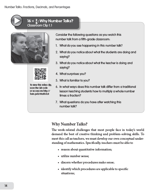 Number Talks also includes streaming video clips that provide a visual platform for teachers to reflect on their current practices and target essential understandings from their readings. The video clips feature number talks filmed in actual elementary classrooms, plus seven bonus videos highlighting interviews with the author and teachers. Clips range from five to ten minutes in length with a total viewing time of approximately two hours. The resource includes reference tables to help you quickly and easily locate the video clips by chapter and grade level.