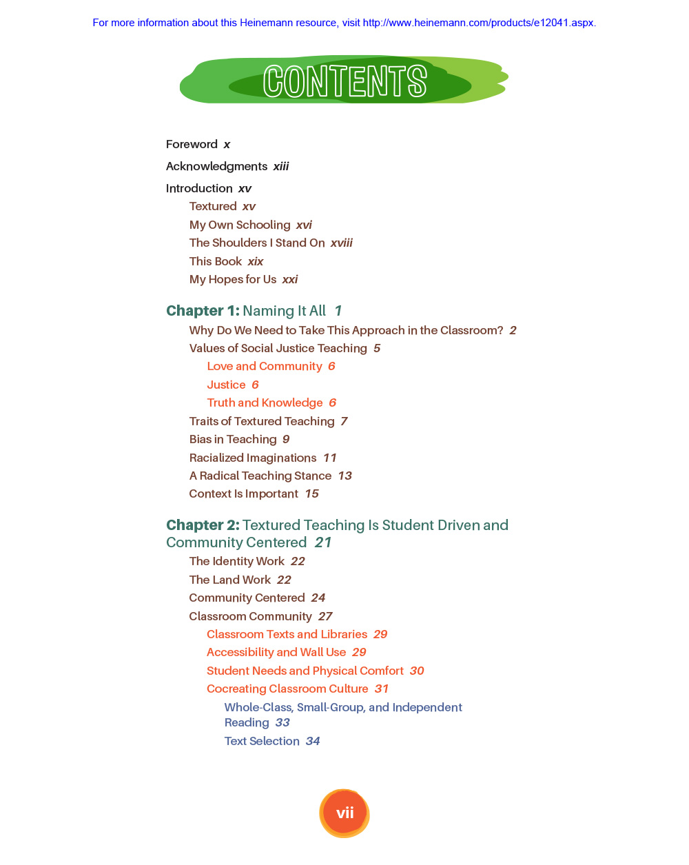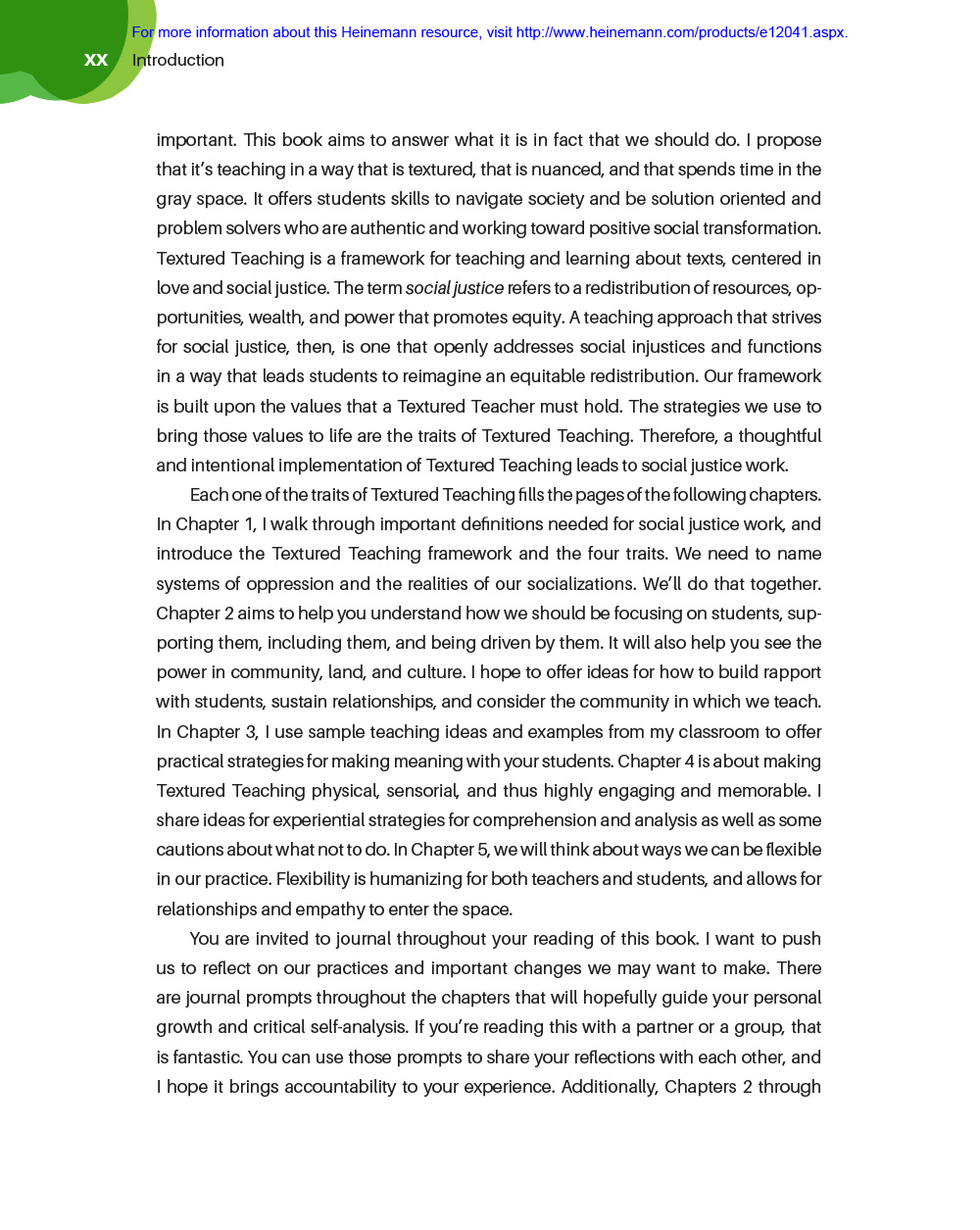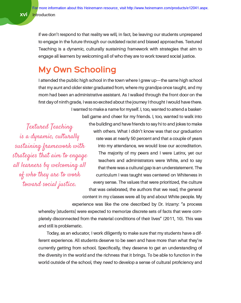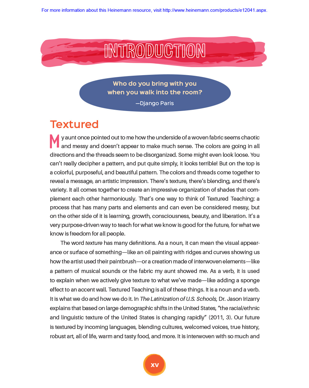 “Textured Teaching is a combination of affirmation, culturally relevant practices, culturally sustaining teaching, and liberating pedagogies. It is love. It is truth-telling. It is nuanced. It is hopeful. It is necessary in its stance and commitment to dismantle harmful schooling practices through pedagogical restoration, equity, and justice. In fact, it is Lorena Escoto Germán’s commitment to anti-oppressive and anti-racist teaching which is felt on every single page of this book, that should encourage us to reimagine teaching as a Project in Humanization that positions teachers as learning partners alongside students. What a beautiful text. What a layered teaching framework. What a textured book. Read it and be left inspired!” --Valerie Kinloch, Renée and Richard Goldman Dean & Professor, School of Education at the University of Pittsburgh