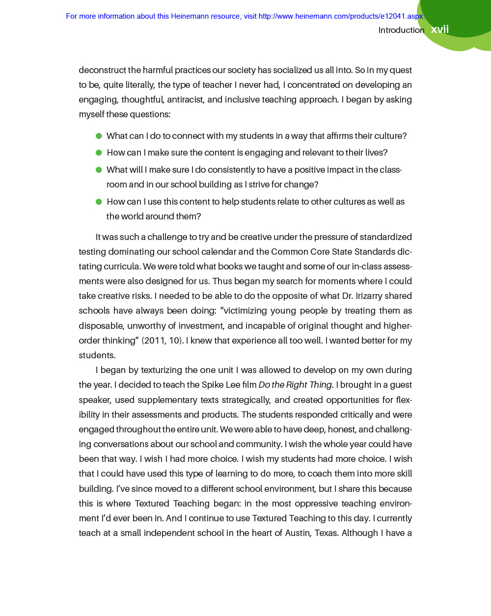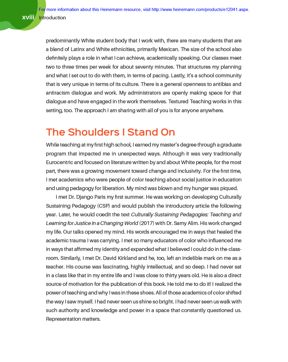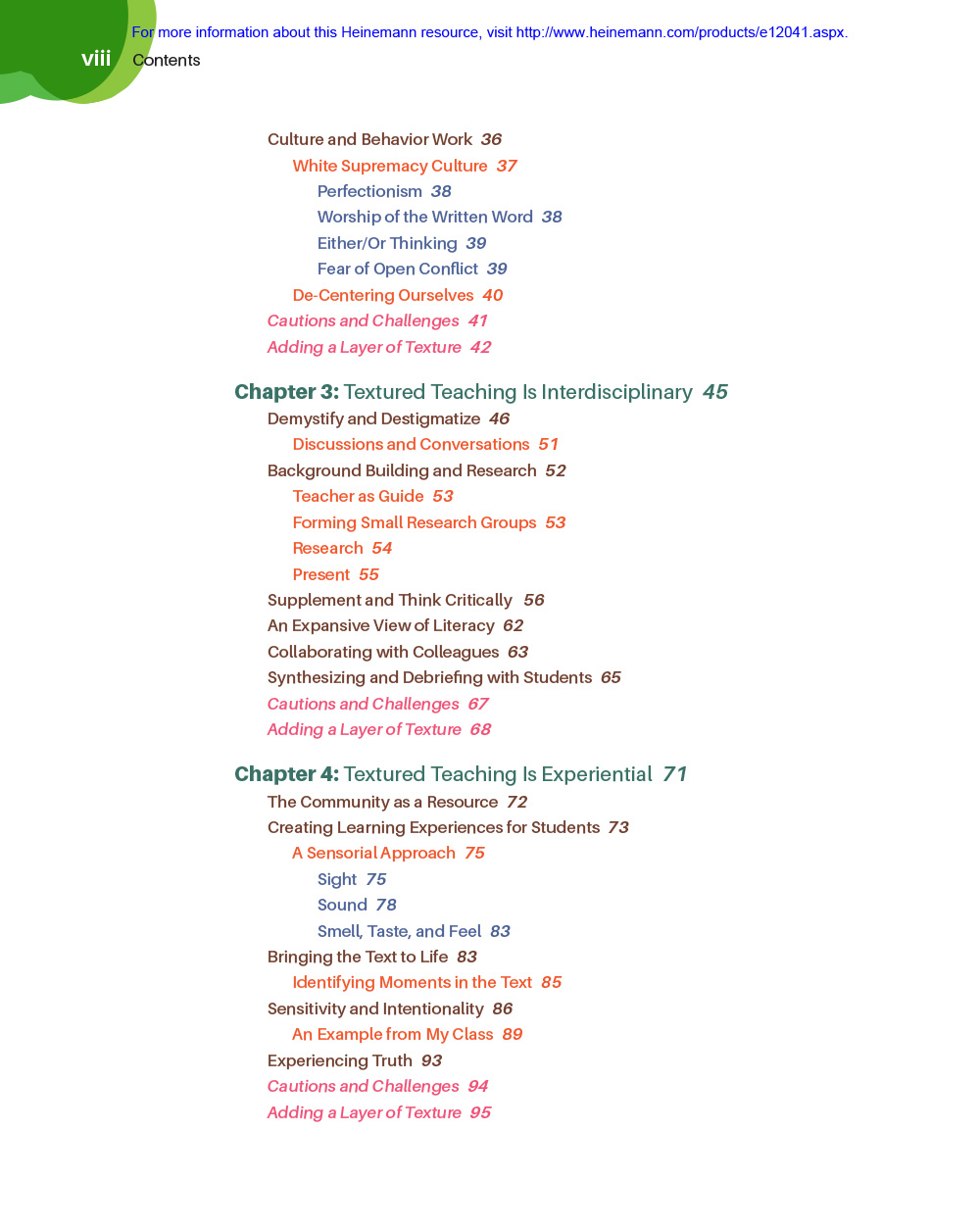 “The craft of teaching is both science and art, but textured teaching suggests that it also wisdom and discovery. The wealth of this approach, subtle in its implication, transformative in its intent, is found at the fertile intersection of where profound education work sits in the lives of youth, to equally empower, enhance, and sustain them while fostering conditions that promise they will grow.” --David E. Kirkland, Executive Director, NYU Metro Center and Professor of Urban Education, New York University