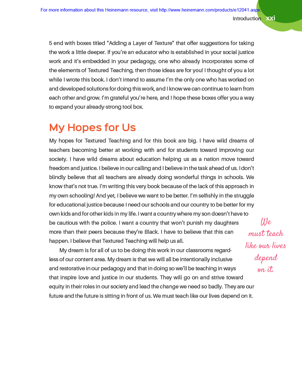 “Lorena Escota Germán walks us through a framework that is realistic, wholistic, liberating, and necessary! Textured Teaching is THE book every teacher should read. Not only does the book guide us into meeting our students where they are and learning who they are, it also helps us [the educators] to grow and become the teachers we are meant to be. Centering education in love, community, justice, truth, and knowledge, Germán pushes us to go beyond ourselves and to be present and to open our hearts to the possibilities of justice centered learning.” --Tiffany Jewell, author of the #1 New York Times Bestseller, This Book Is Anti-Racist