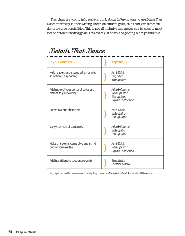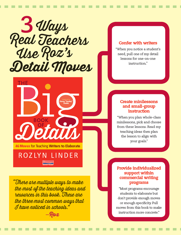 “This is what I want for my students,” writes Roz Linder, “to use details in their writing in a meaningful way that conveys their ideas and their purpose.” If you want that too, then make her Big Book of Details part of your teaching toolkit.