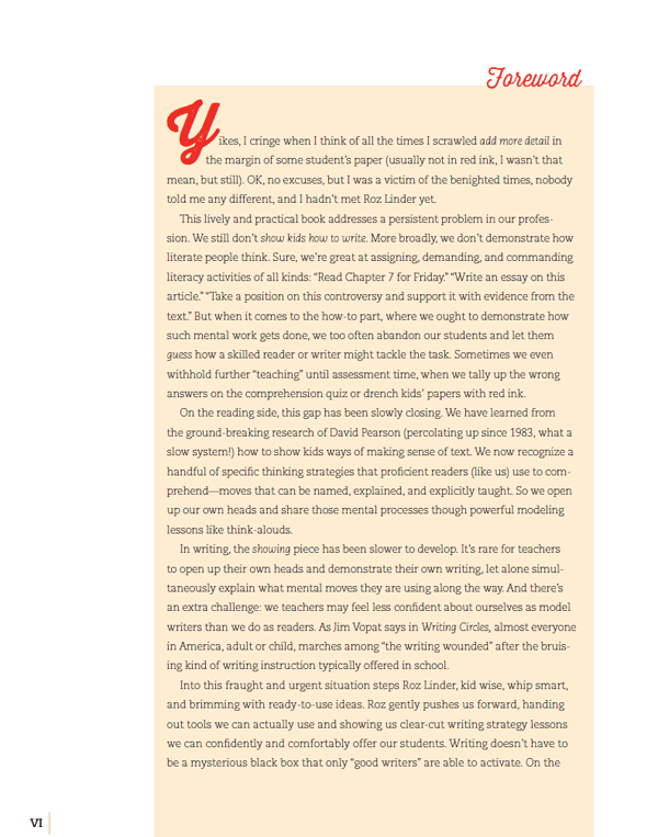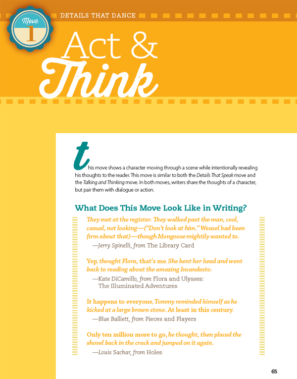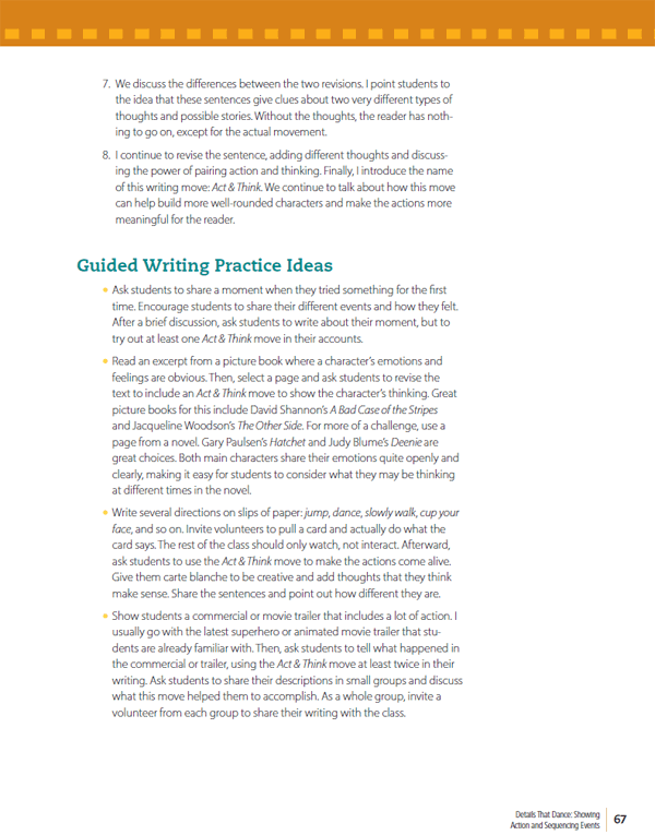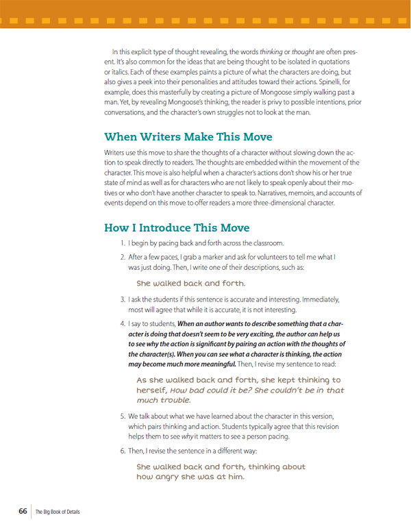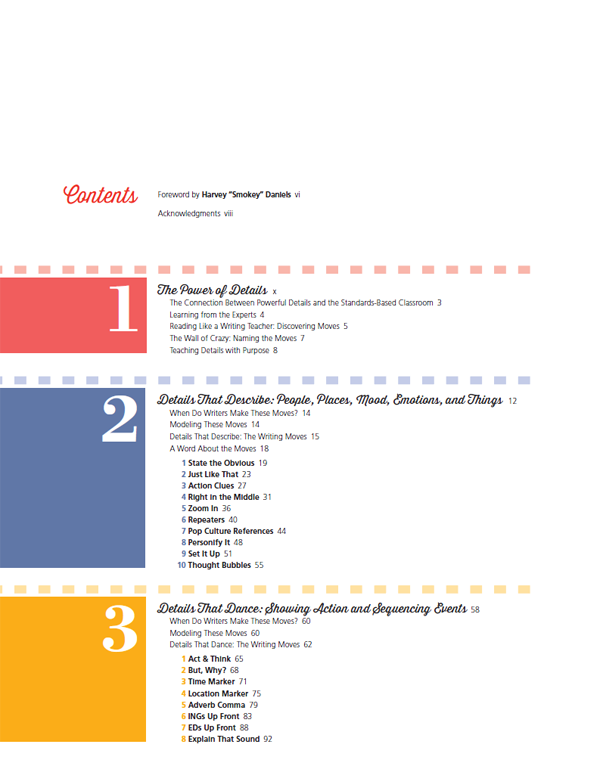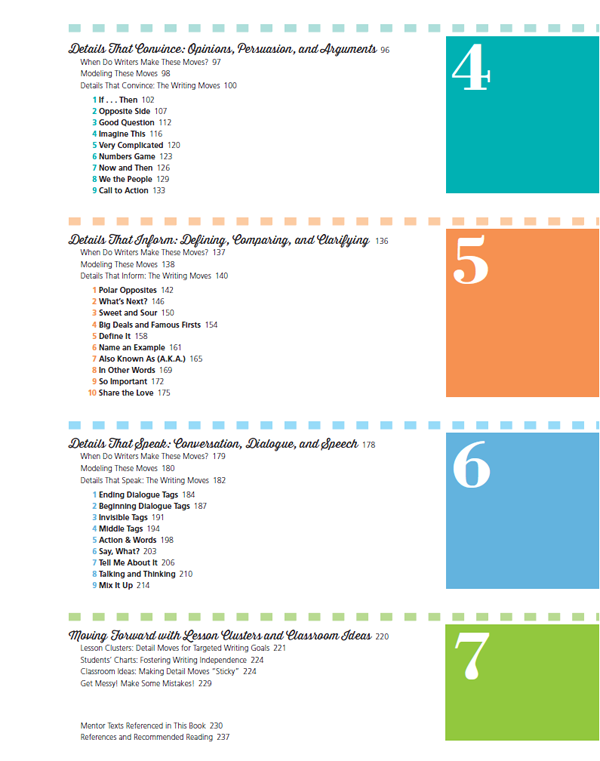 “The writing lessons in this book are organized to quickly unpack the detail move, explain when and why the strategy works well, share how I have taught it to my students, and offer ways to make it your own.”