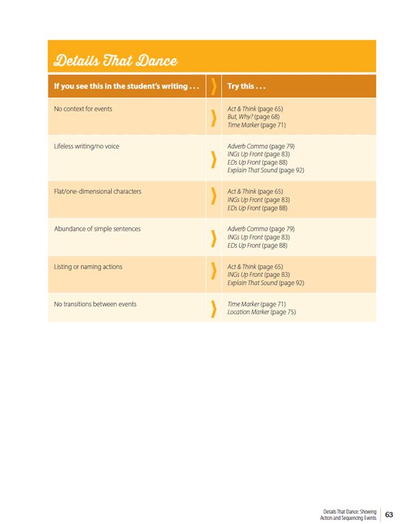 Roz breaks elaboration into 5 categories and shares 46 lessons based on the moves that professional writers use. With if–then charts that connect student needs to just-right strategies, you’ll help writers master details that: